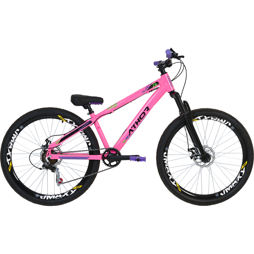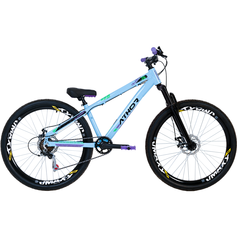 Quadro Athor freeride em alumínio 6061, disponível em duas cores incríveis, aros 26" VMaxx e pneus Slick, que trazem um novo conceito de aventura sobre duas rodas. Desenvolvida para tornar cada manobra uma história cheia de adrenalina.